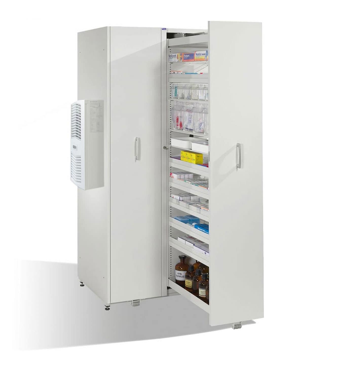 Zur Lagerung von temperatursensiblen Medikamenten kann der Schrank auch mit Klimagerät erworben werden. Einstellbereich von 20–25°C.